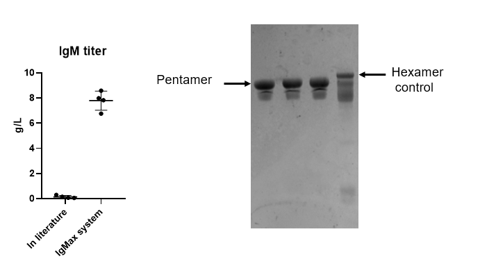 在細(xì)胞株構(gòu)建階段,漢騰生物研發(fā)團(tuán)隊(duì)選擇了具有最高穩(wěn)定性和特定生產(chǎn)力的CHO細(xì)胞系作為最終的先導(dǎo)克隆,并且通過調(diào)節(jié)載體比例改變產(chǎn)生的抗體滴度。漢騰生物IgMaxTM表達(dá)載體平臺(tái)最高可以達(dá)到8g/L的產(chǎn)量,并且IgM構(gòu)型均一,其中,五聚體比例接近100%,幾乎無六聚體產(chǎn)生(IgM有五聚體和六聚體形式,包含開放J鏈的五聚體形式是開發(fā)和生產(chǎn)IgM的目標(biāo)構(gòu)型)。