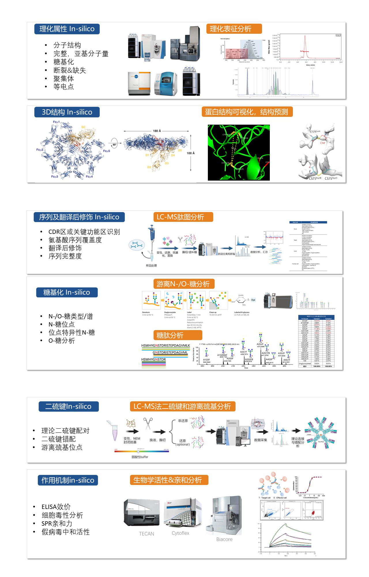 基于序列分析和3D空間結(jié)構(gòu)測量,能夠獲得蛋白分子量、等電點、消光系數(shù)、二硫鍵、游離巰基、糖基化等信息,進(jìn)一步對潛在風(fēng)險翻譯后修飾、分子完整性、聚集性、疏水性等屬性進(jìn)行預(yù)測。3D可視化能夠加深對功能位點和作用機制的深刻理解,結(jié)合平臺經(jīng)驗,進(jìn)行風(fēng)險識別和應(yīng)對策略評估,此外結(jié)構(gòu)和分子背景的全面科學(xué)理解,對上下游工藝,分析方法,制劑開發(fā)能提供有力參考。